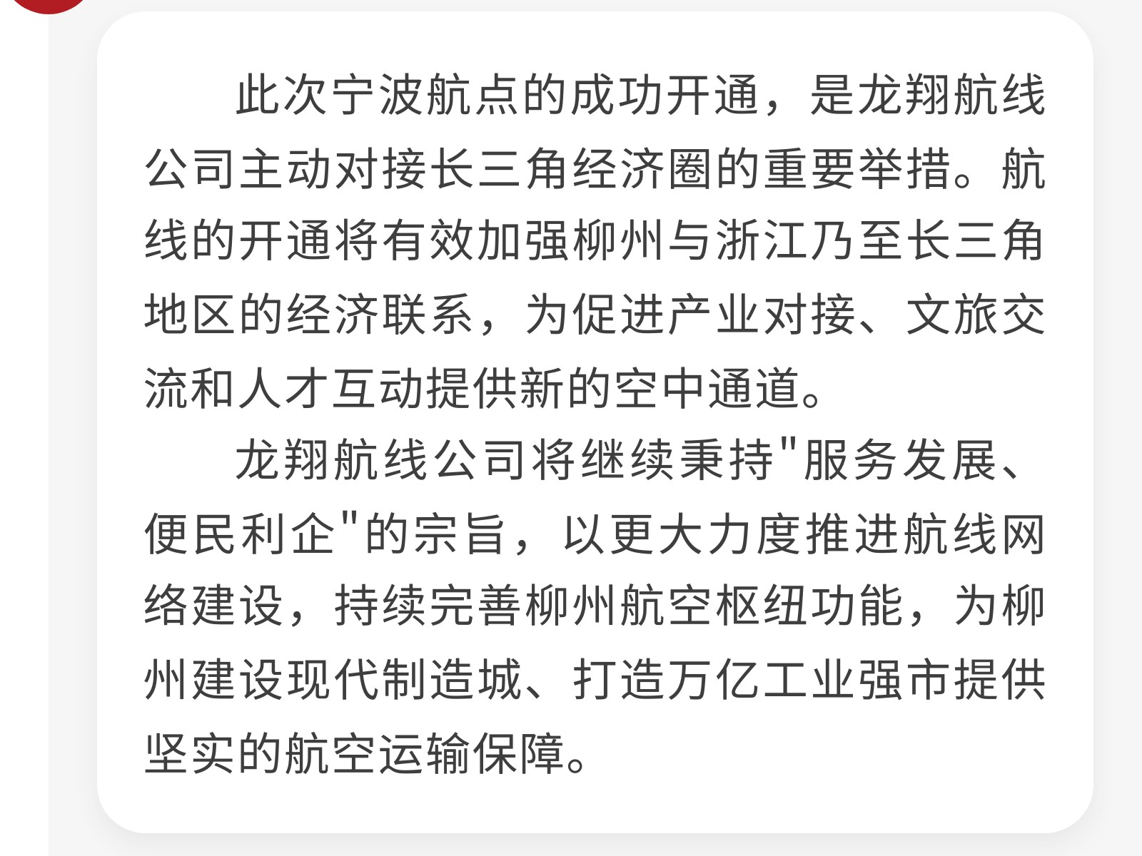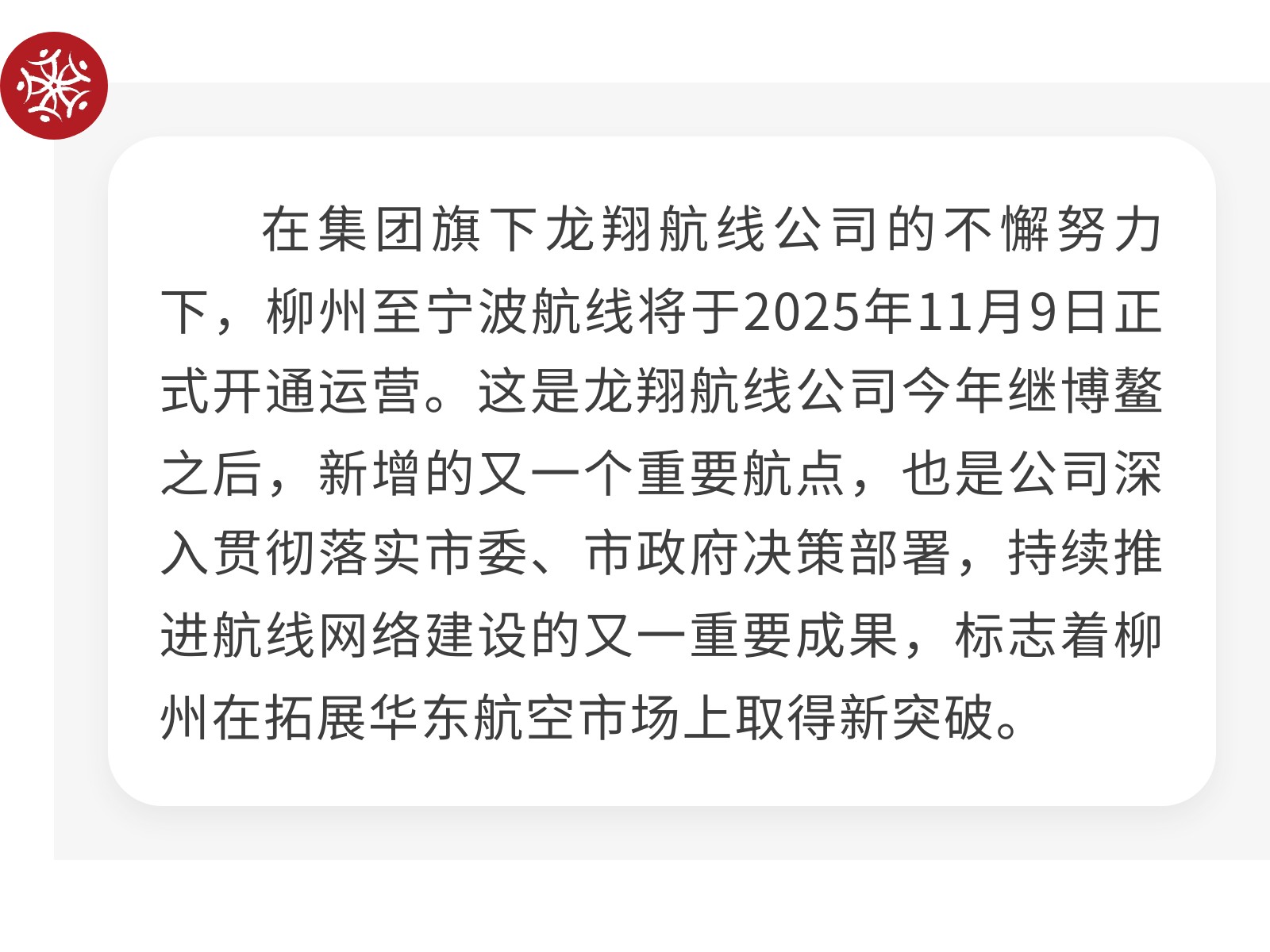 航線布局再突破!集團旗下龍翔航線公司成功開通寧波新航點 發(fā)布時間:2025年11月12日 11時來源:本站原創(chuàng)瀏覽:66 人次