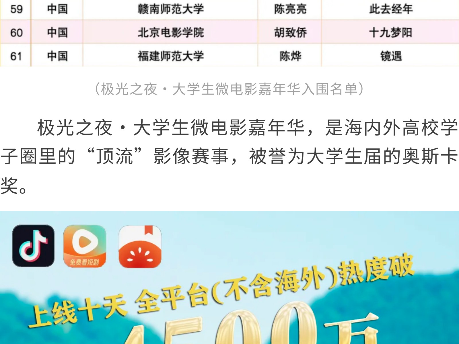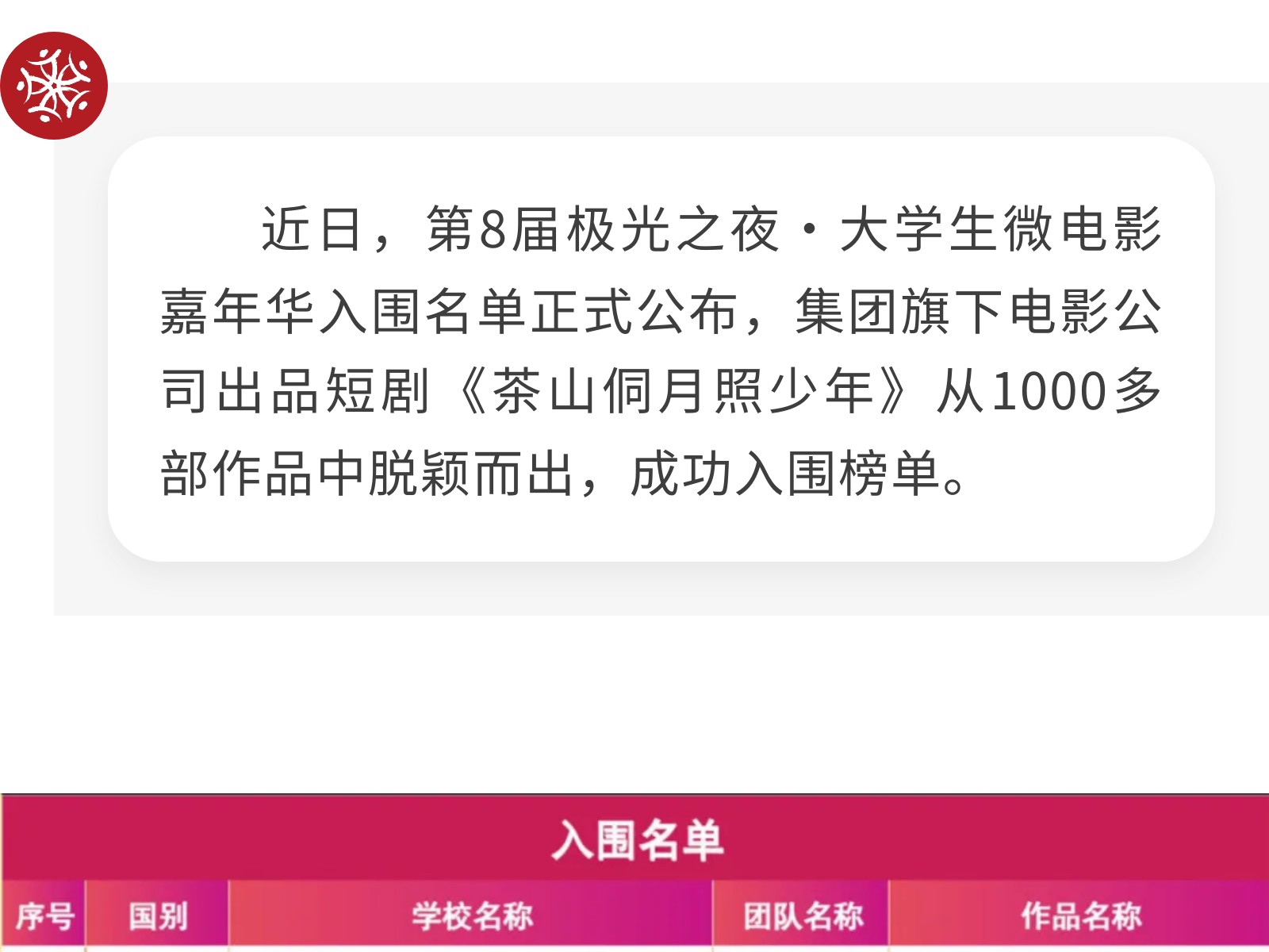 喜報!集團旗下電影公司出品短劇《茶山侗月照少年》入圍第8屆極光之夜·大學(xué)生微電影嘉年華 發(fā)布時間:2025年10月14日 15時來源:本站原創(chuàng)瀏覽:158 人次
