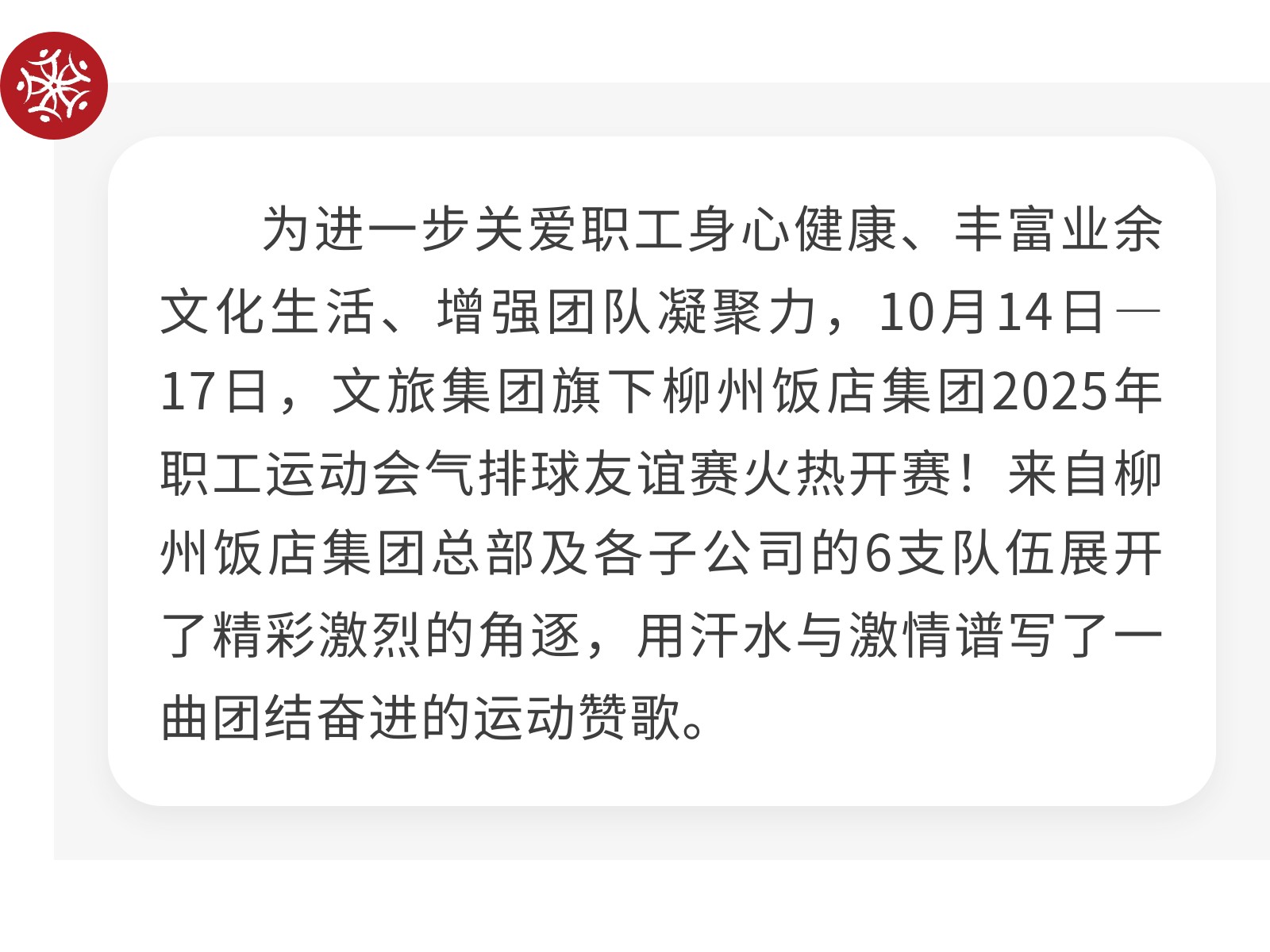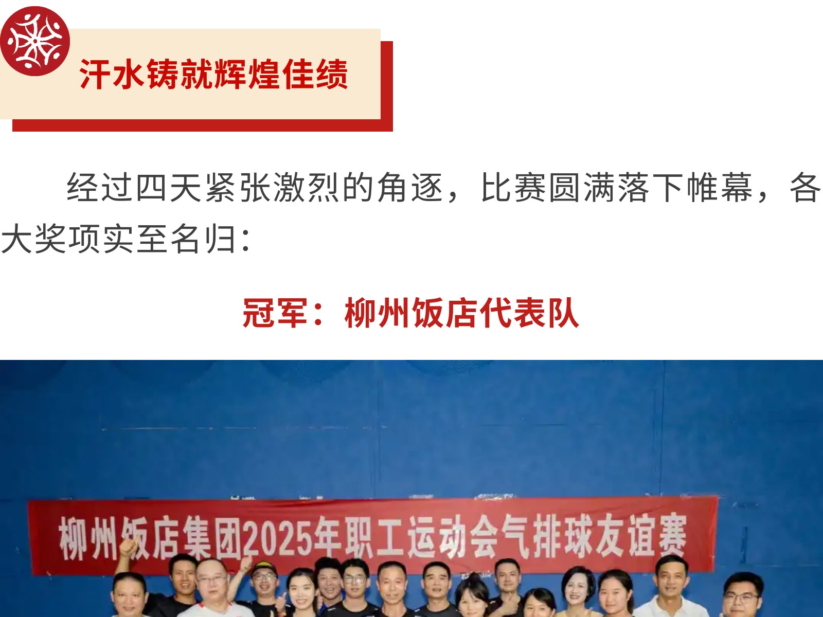 【引爆激情 “扣”動未來 】柳州飯店集團2025年職工氣排球賽燃情收官 發(fā)布時間:2025年10月22日 10時來源:本站原創(chuàng)瀏覽:73 人次