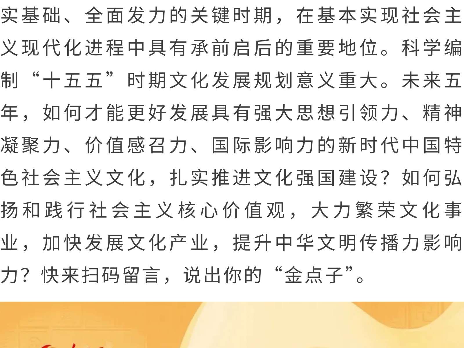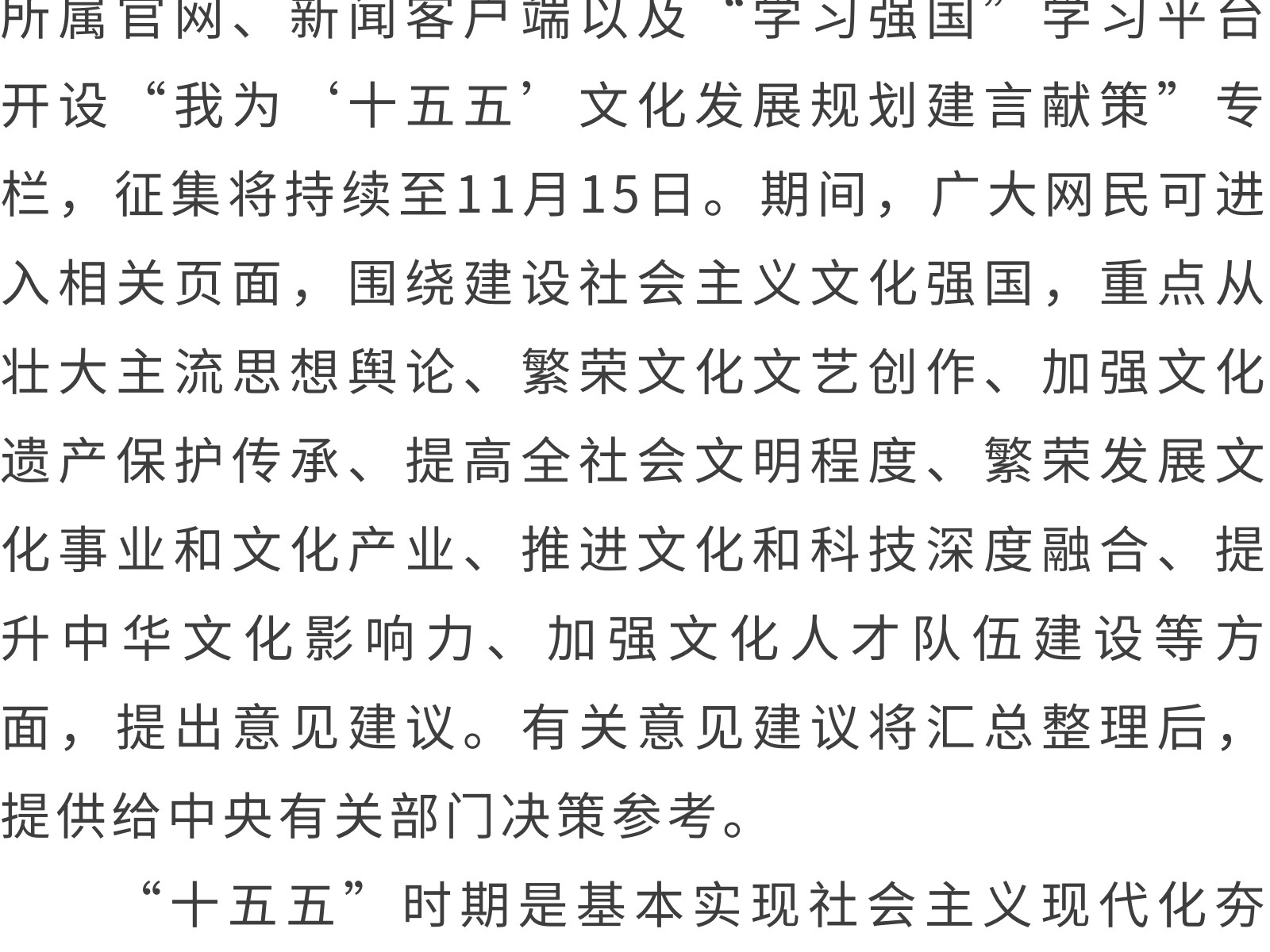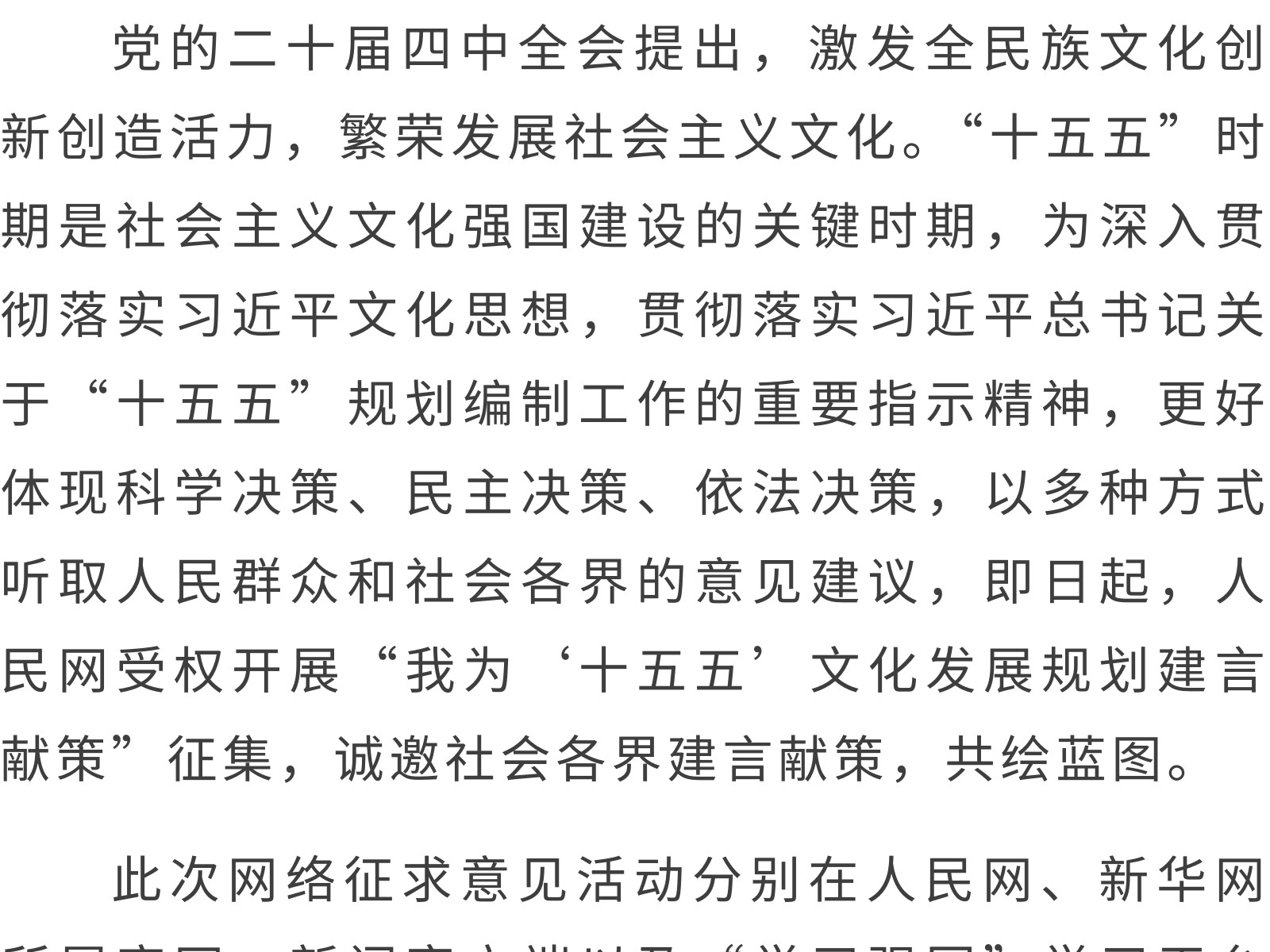 “十五五”文化發(fā)展規(guī)劃編制工作開展網(wǎng)絡(luò)征求意見活動 發(fā)布時間:2025年11月11日 11時來源:本站原創(chuàng)瀏覽:131 人次