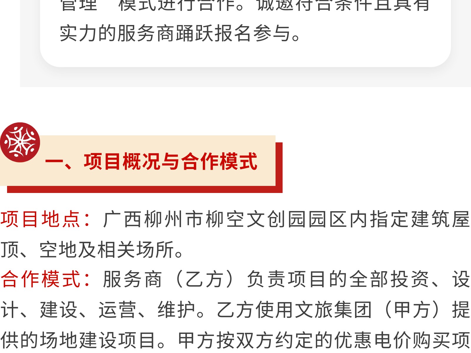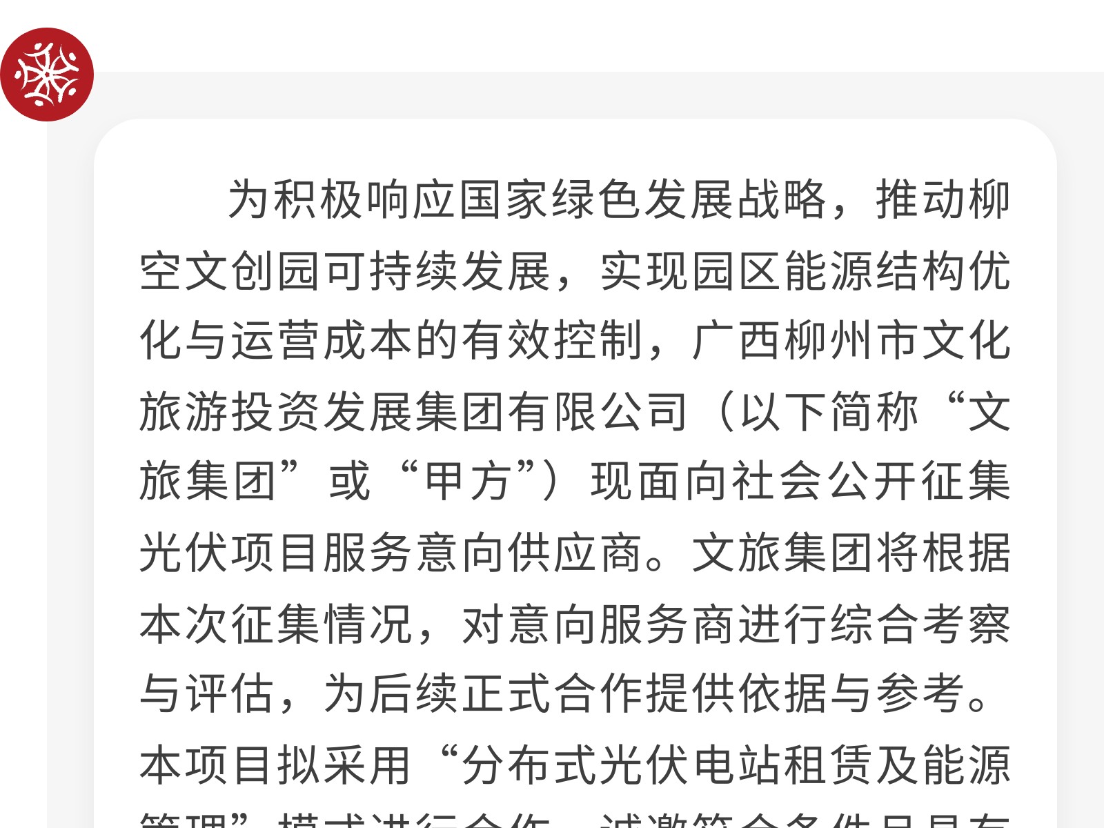 廣西柳州市文化旅游投資發(fā)展集團(tuán)有限公司關(guān)于為柳空文創(chuàng)園公開招募光伏項(xiàng)目意向服務(wù)商的公告 發(fā)布時(shí)間:2026年01月22日 12時(shí)來源:本站原創(chuàng)瀏覽:23 人次