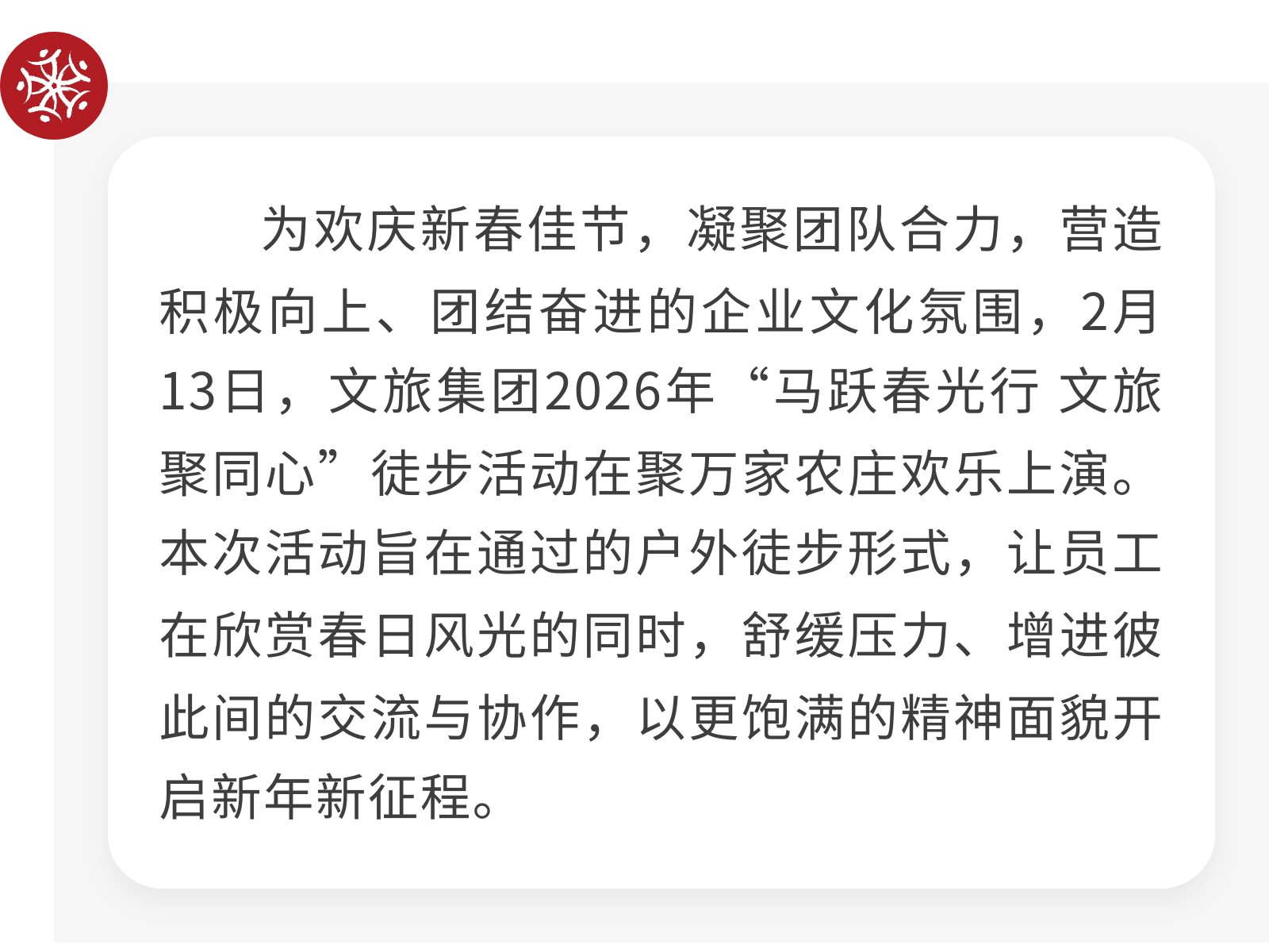 “馬躍春光行 文旅聚同心”——文旅集團徒步活動圓滿落幕 發(fā)布時間:2026年02月16日 13時來源:本站原創(chuàng)瀏覽:8 人次